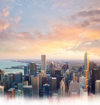 A view of a city as from an aircraft or skyscraper.